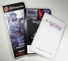 Give us a call today for the most competitive pricing and highest quality you will find in the industry! We can custom manufacture your products in a large variety of vinyl, leather or canvas materials, as well as provide multi-color imprints. If you need a custom size tally book, grease or mud log insert, give us a call, as custom products are our specialty. The inside pages may be printed with your own custom form and information pages. We offer a variety of binding methods as well as the traditional sewn style. Vinyl covers are stocked in red, white, blue, black & green. Custom colors available on request. Write or call for pricing on optional clear insert pages and printed inserts to hold your valuable reference information.